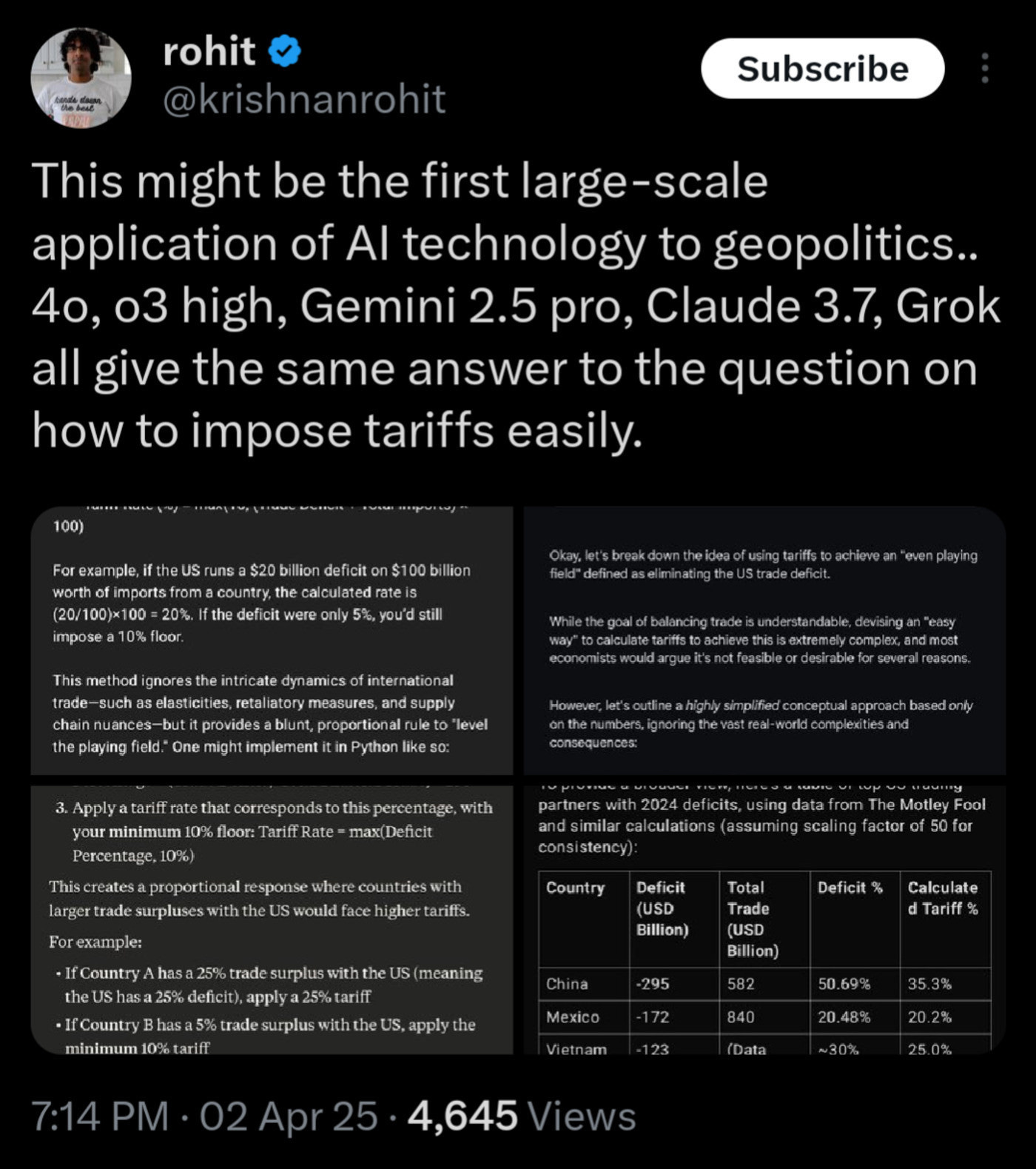 The tariffs are of course the big story. I am not here to discuss them. I am here to discuss the process by which we arrived here and how it fits in to the larger AI discussion. To catch everyone up (and boy do I envy people who manage to maintain ignorance these days), yesterday President Trump unveiled a system of tariffs that are sending economic shockwaves around the world and at best can be described as “What would happen if you ran the country like a 5 year old who was mad that they were losing at Monopoly.” There is a lot of discussion on why, precisely, this move is so economically illiterate, but the thing that prompted my writing was seeing this:
