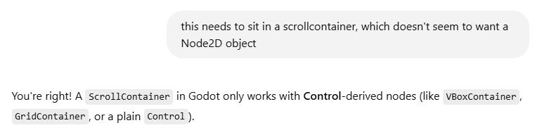 After much back and forth I was able to coax a correct answer out of the AI and get my scrollable pane working. But I am a gameplay programmer with almost 20 years of experience. I am as close as you can get to an “expert” on the subject. If I were in my 20s, fresh out of college? I would have had no chance of landing on the correct solution. All the AI in the world won’t help if you don’t have a solid understanding of the ground you are walking on.