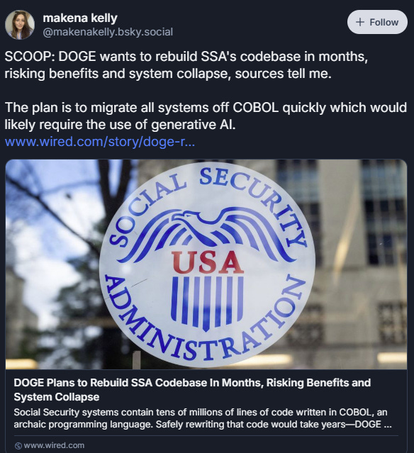 This brings us back to DOGE. What we are seeing here is a case study in AI maximalism with no expert oversight. A group of unskilled techies who think they can code their way through every problem and the experts are just wet blanket nuisances that they can bypass, and as a result are stepping on every rake imaginable and appear on track to annihilate our economy as well as the United States’ century of global dominance. People who mistake technical skill with computers for generalized skill to solve all the problems.
