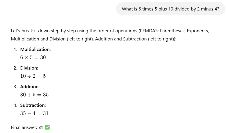 Lets say you are setting up an economic policy and need to math out some parameters to make sure it will hit some threshold that will ensure it is beneficial. So you ask the AI “What is 6 times 5 plus 10 divided by 2 minus 4?” Those of us with a high school math education will remember their “Please Excuse My Dear Aunt Sally” order of operations and will evaluate 6 * 5 + 10 / 2 - 4 as 6 * 5 (30) plus 10 / 2 (5) minus 4 and come out with the answer of 31. Indeed, this is what the AI will give you.
